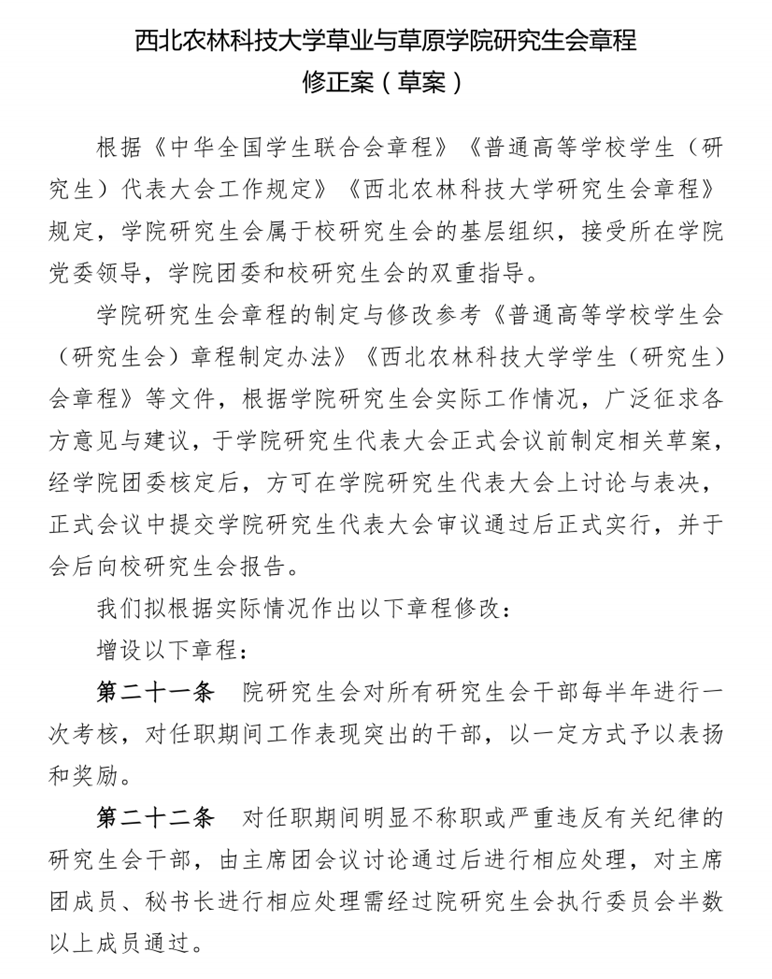 为进一步规范学院研究生会内部管理,加强研究生会干部队伍建设,健全考核评价与激励监督机制,根据《中华全国学生联合会章程》《普通高等学校学生(研究生)代表大会工作规定》及《西北农林科技大学研究生会章程》等文件精神,结合我院研究生会工作实际,草业与草原学院研究生会近期拟对现行章程进行修订,现已形成《西北农林科技大学草业与草原学院研究生会章程修正案(草案)》。
