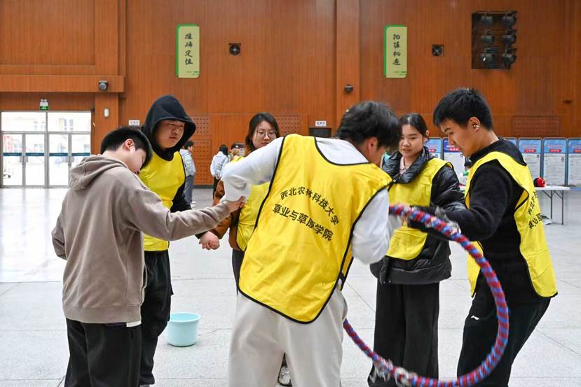 开幕式上,党委研工部文晨老师深情寄语,勉励学子以拼搏诠释青春担当,以团结凝聚奋进力量,为整场活动注入澎湃动力。“妙笔生花,心有灵犀”你画我猜脑洞大开,画笔与想象碰撞出智慧火花;“飞夺泸定桥”海绵垫接力惊险刺激,团队默契在步步为营中升华;“你是我的眼”蒙眼障碍挑战默契爆棚,信任与协作在黑暗中闪闪发光;“背靠背运球”气球接力欢笑不断,背对背的依靠传递出同频共振的节奏;压轴“五子棋争夺”更是激情拉满,你追我赶间上演脑力与速度的巅峰对决。一系列创意的比拼让赛场成为欢乐海洋,更在协作与竞争中凝聚起西农学子的青春合力。